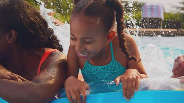 Smiling multi-generation family on summer holiday in swimming pool floating on airbed and splashing- shot in slow motion