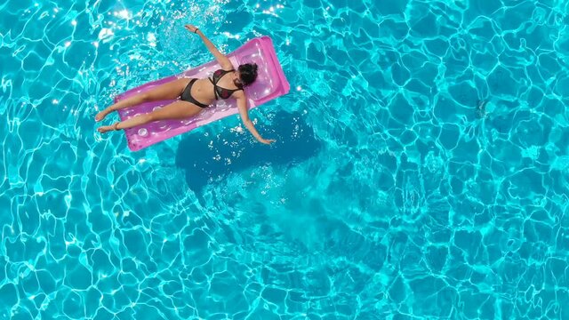 Summer day by the pool. Beauty model lying on inflatable mattress in poolside. Beauty woman floating in turquoise water. Beauty model relaxing in pool. Girl resting on water float.