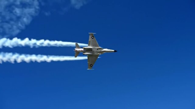 A gray jet aircraft soars through a vibrant blue sky, leaving a contrail