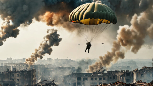 Military forces with parachute between smoke in sky top of destroyed city, widescreen 16:9, 300 dpi, with space for text