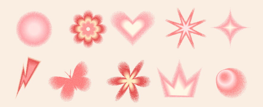 Blur coquette geometric shape with grain noise gradient set. Y2k retro heart, star and circle with flower. Colorful gradation butterfly, crown on beige background. Vector illustration.