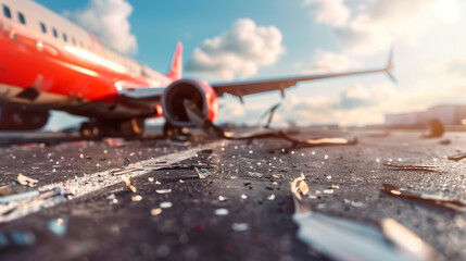 The wreckage of a civil aircraft lies on the road in an accident close-up