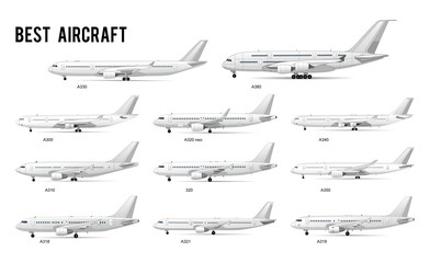 Different kind airplanes commercial models set vector illustration. Collection consist of modern types of best aircrafts flat style design. Large and small air passenger ship. Isolated on white
