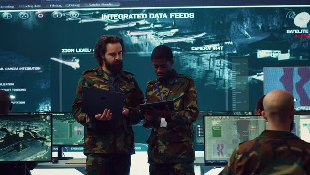 Officers team managing air traffic control for military aircrafts within the operational area, using CCTV radar surveillance. Evaluating and presenting mission plans to their crew. Camera A.