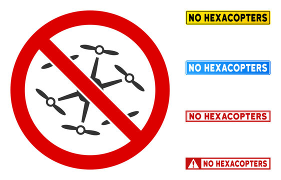 No Hexacopter sign with phrases in rectangular frames. Illustration style is a flat iconic symbol inside red crossed circle on a white background. Simple No Hexacopter vector sign, designed for rules,