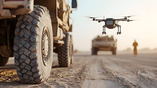 Drone and military equipment against the background of the road. ground and air combat equipment. Military technologies. Arming the army with UAVs