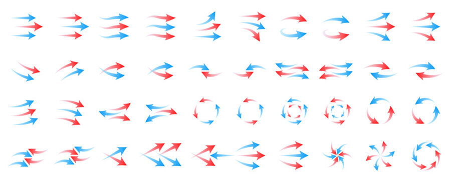Arrow wind air flow set icons, hot and cold wind flow, airflow and ventilation, climate control, air direction circulation motion and strength signs