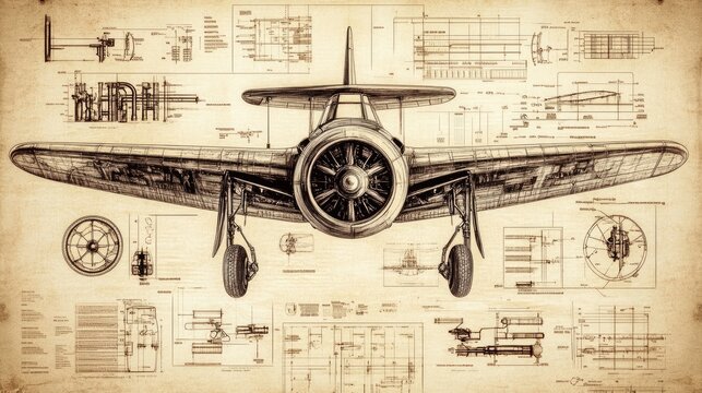 Schematic design of a Spitfire fighter aircraft with detailed technical drawings