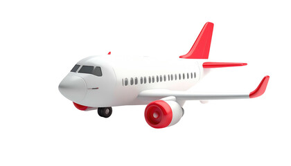 White airplane with red accents rendered against a black background. 3D graphic of a flying machine