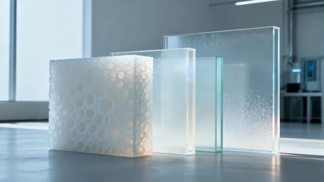 Medium shot of translucent aerogel insulation panels glowing softly under natural light highlighting their ultrathin lightweight thermal barrier properties in a modern setting.