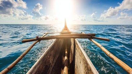 outrigger. Traditional canoe with wooden outrigger on calm blue ocean under tropical sun. mobility guides, transit brochures, designed for mobility and urban transit guides.