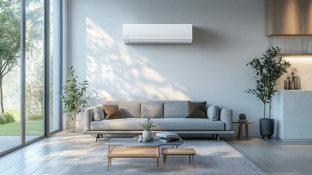 The air conditioner with blue effect in the modern living room feels refreshing and cool