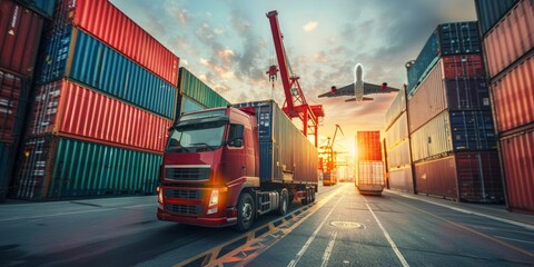 Global business, logistics and transportation, import, export, goods, container ship at international port. Cargo plane flies over truck transport container logistics industry