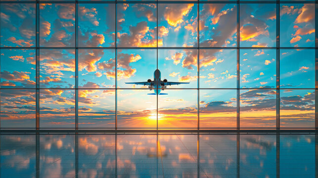 Airplane Silhouette Against Breathtaking Sunset Sky Viewed from Modern Airport Terminal