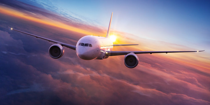 Commercial airplane jetliner flying above dramatic clouds in beautiful sunset light. Travel concept.