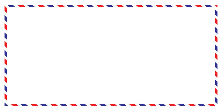 Airmail envelope frame with blue and red stripes on white background. International vintage letter border. Retro air mail postcard. Blank envelope. Vector illustration isolated on white background.