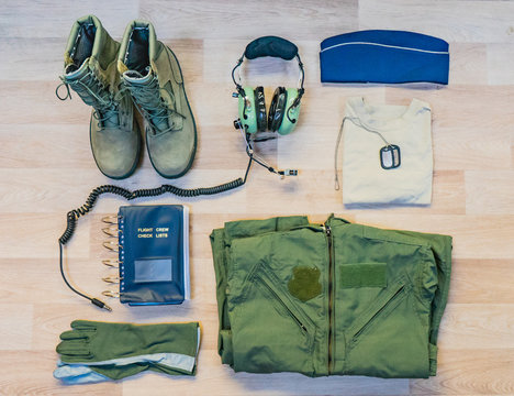 Military flying airman uniform with headset flat lay background