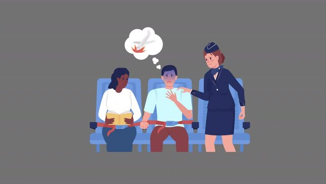 Woman firmly holds man's hand during flight in plane. Aerophobia of altitude concept.