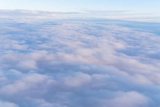 Background of a pink heavenly sky with fluffy dense clouds, top view from an airplane. Can be used as advertising background, overlay. Travel concept.