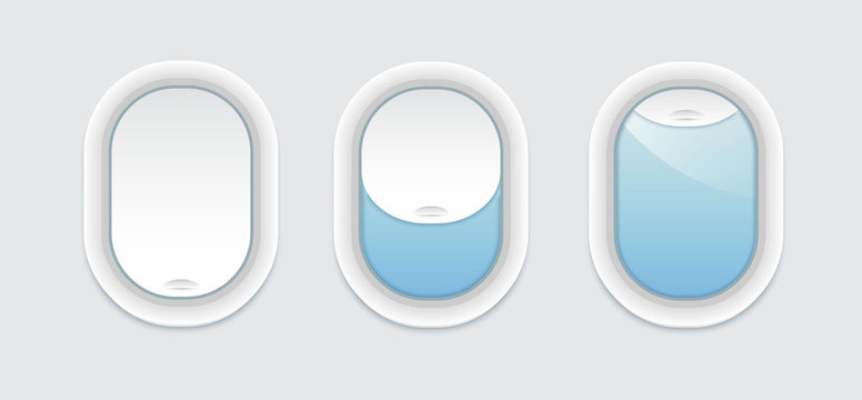 Three airplane windows inside view. Vector porthole with transparent glass. Aircraft open and closed window template isolated.
