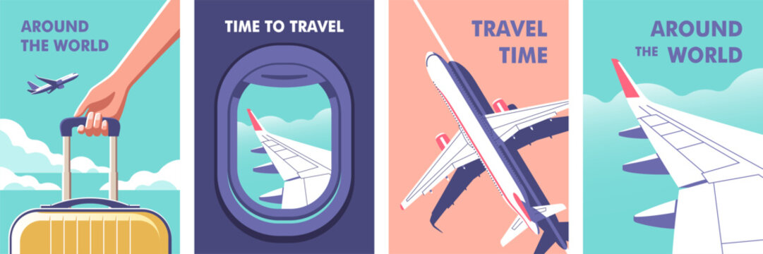 View through the porthole of aircraft. Airplane windows set. Various skyscapes through portholes. Mountain, space, planets, clouds and wings. Hand drawn Vector illustration. Travel, journey concept