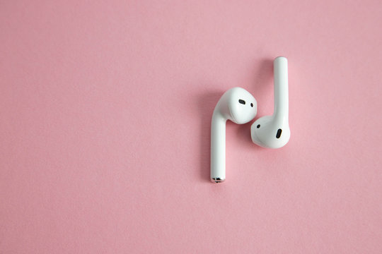 wireless white headphones without cord, lying next to each other on a pink background. Place for text