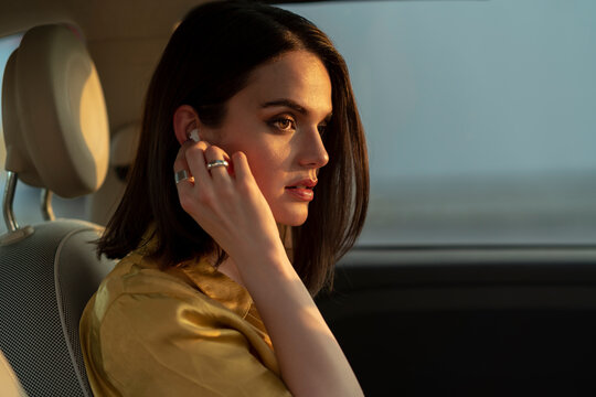Beautiful young woman with wireless headphones. Listening music in the nature