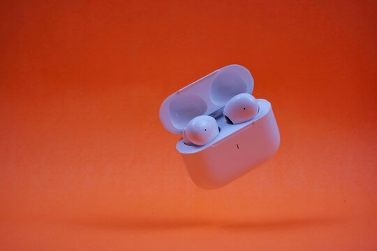 Modern Wireless Earbuds and Charging Case on Bright Orange Background