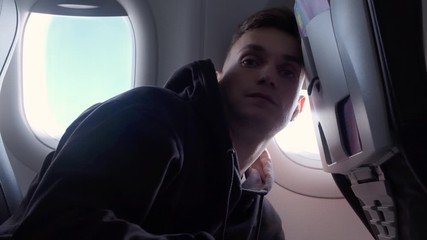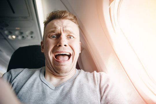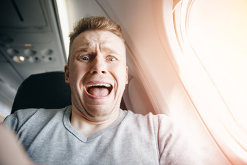 Male passenger in plane screams and cries, aerophobia. background of porthole. Concept fear of flying on airplane