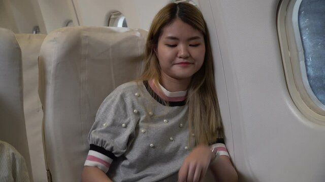 Portrait image of a woman get airsick and headache while traveling on airplane