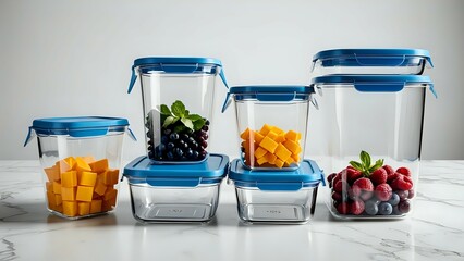 Set of airtight glass food storage containers with blue lids, filled with fresh fruit; perfect for meal prep and organization.