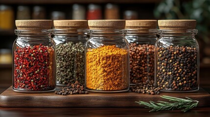 Beautiful closeup of a pile of dried pumpkin or pepita seeds pour out from a glass jar airtight container on the wooden kitchen counter. The seeds contain lots of nutrients for heart health and bones.