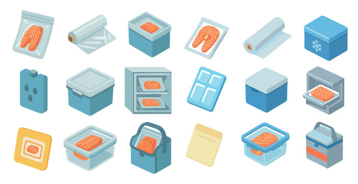 Food storage isometric icons set – 3d, preservation, kitchen organization symbols