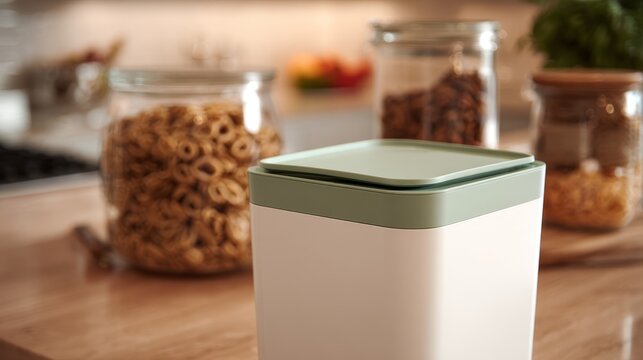 Pet food storage container with airtight seal detail. Modern kitchen counter
