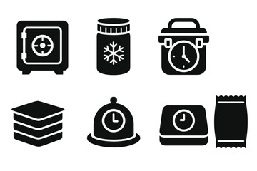 Preservation Icon Set. Solid style icons of preservation containers: vacuum-sealed vault, cryo-food jar, airtight heritage box.