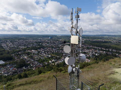 A tall communication tower stands alone in a golden field against a serene blue sky, symbolizing connectivity and technology.
