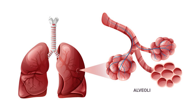 Human lung anatomy structure diagram with front and cross section view, educational medical poster design healthcare scheme, human lung internal organs. Labeled alveoli, trachea, thyroid, lobes.