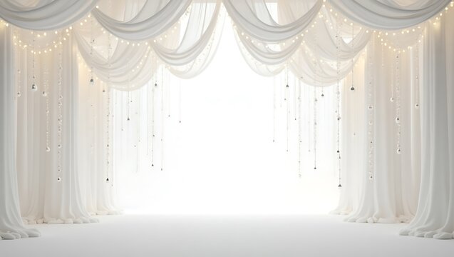 Elegant white curtain backdrop for wedding photography and event decoration with string lights and soft fabric