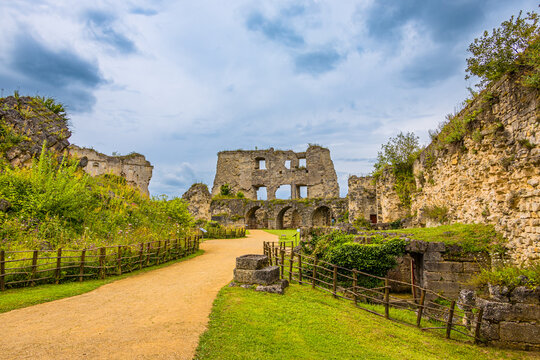 Aerial view over the Dungeon of Septmonts in Aisne, Picardie, France - Built in the 14th century, this medieval tower was used both for military and residential purposes