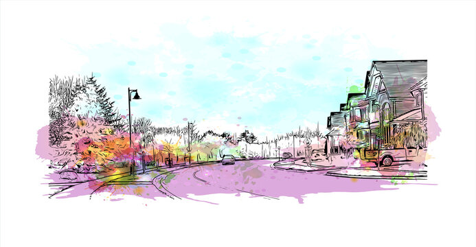 Building view with landmark of Ajax is a town in Durham Region in Southern Ontario, Canada. Watercolor splash with Hand drawn sketch illustration in vector.