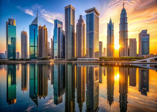 Modern sleek skyscrapers with reflective glass and steel facades pierce the sky in a bustling metropolis of Dubai or Abu Dhabi at sunset or dawn.