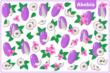 Set of vector cartoon illustrations with Akebia exotic fruits, flowers and leaves isolated on white background