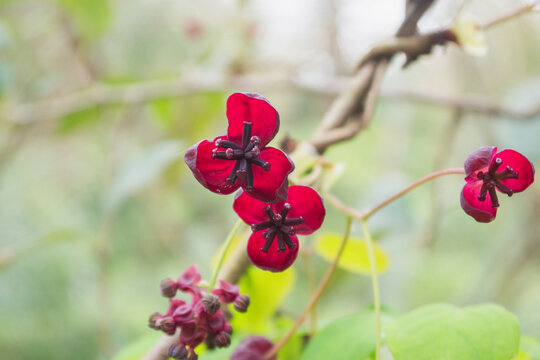 Vivid Red Akebia Quinata Flowers on a Twisting Vine in Bloom