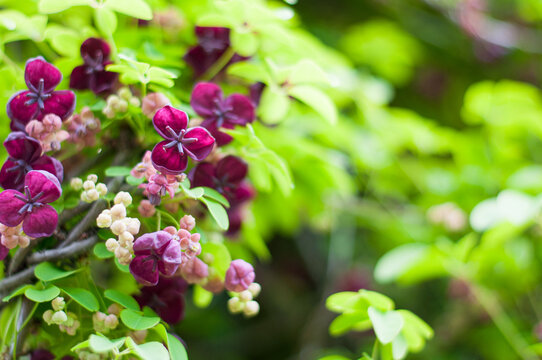 Akebia quinata dark-purple flowers with unfocused background. Close-up. Small unusual Chocolate vine purple flowers