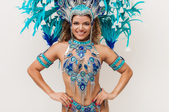 Beautiful samba dancer portrait with arms akimbo while wearing traditional costume
