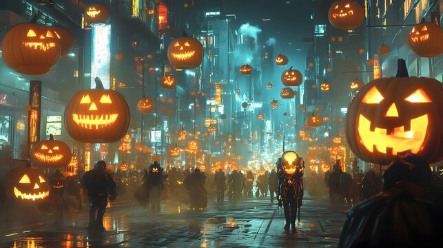 Futuristic Halloween Parade with Glowing Jack o  Lanterns and Holographic Costumes
