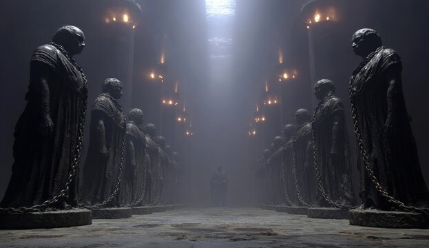 The anunaki with the children of god in chains in a dark sinister setting. group of deities from ancient Mesopotamian mythology, primarily known from Sumerian, Akkadian, Assyrian. Depicted as gods.