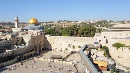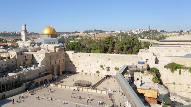 View of the Wailing Wall in Jerusalem, with the Temple Mount, Dome of the Rock and the top of the Al Aqsa Mosque. The Mount of Olives in the background and access to Temple Mount in the foreground.