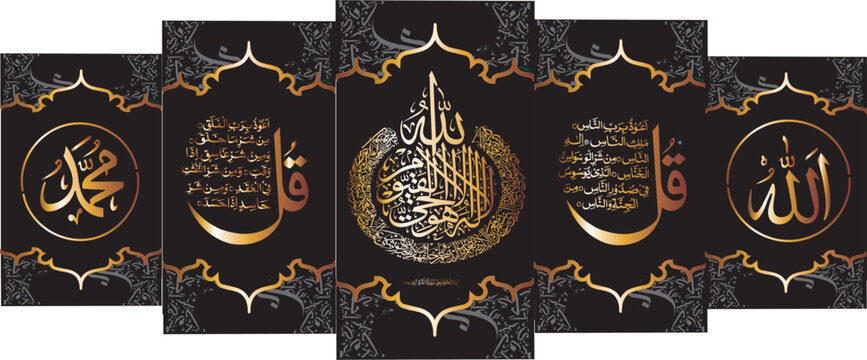 slamic calligraphic Name of God And Name of Prophet Muhamad with verse from Quran Baqarah Ayat Al Kursi translated: "God There is no god but He the Living, The Self-subsisting, Eterna" Ayatul Kursi