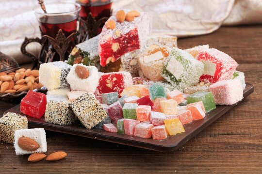 Collection of traditional Arabic sweets and candies to celebrate "Prophet Muhammad's Birthday Event". Varieties of Egyptian Mawlid Sweets or " Halawet Al-Mawlid Al- Nabawi".